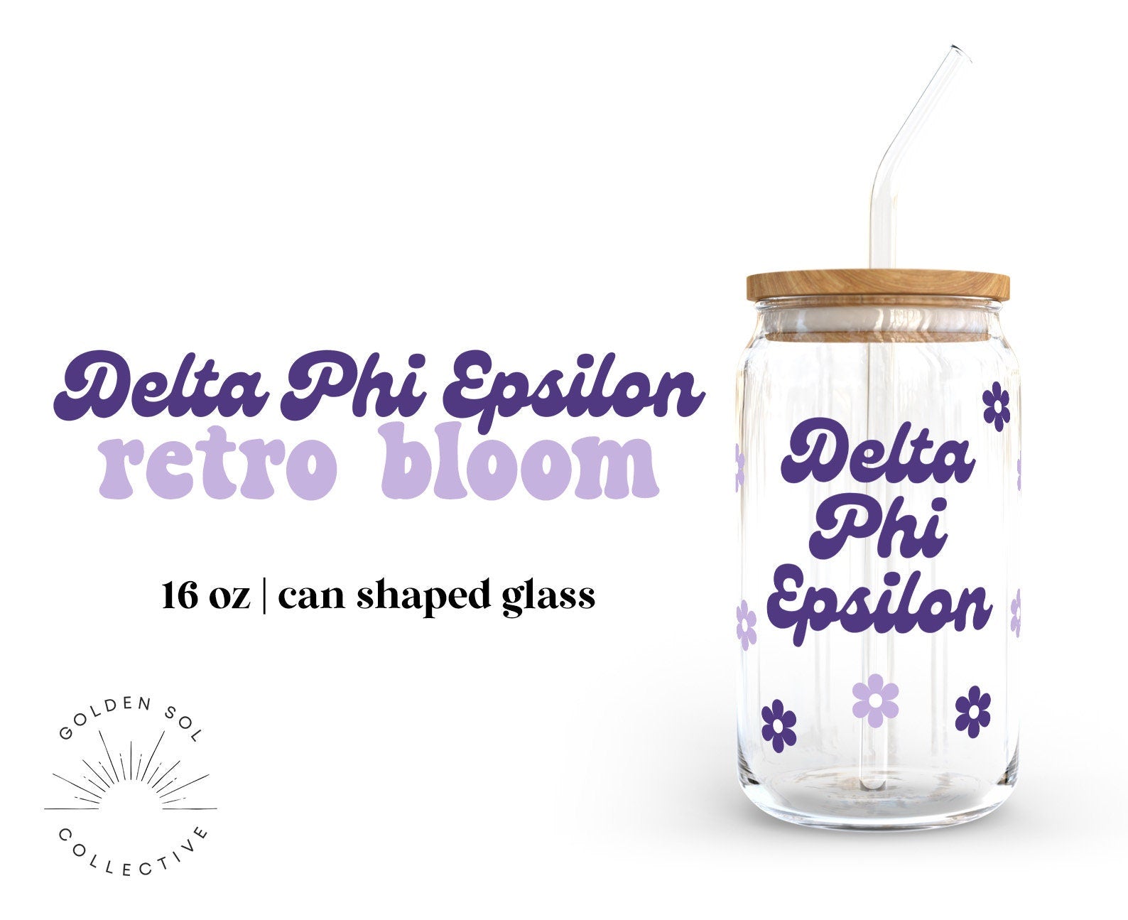 Perfect for everyday use, special events, or as a thoughtful gift to a sister you love, our Delta Phi Epsilon can-shaped glass with bamboo lid and glass straw is the epitome of modern sophistication and sustainability. Elevate your DPhiE collection and make a statement with your custom color palette and our Delta Phi Epsilon glass that combines style, functionality, and eco-friendliness.